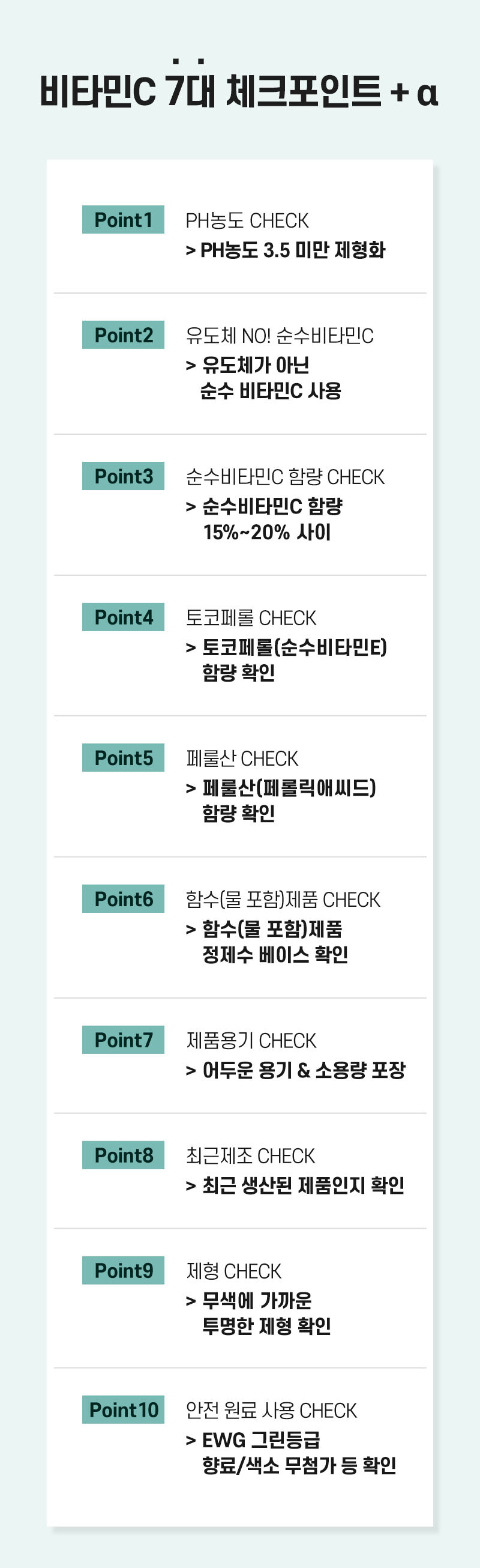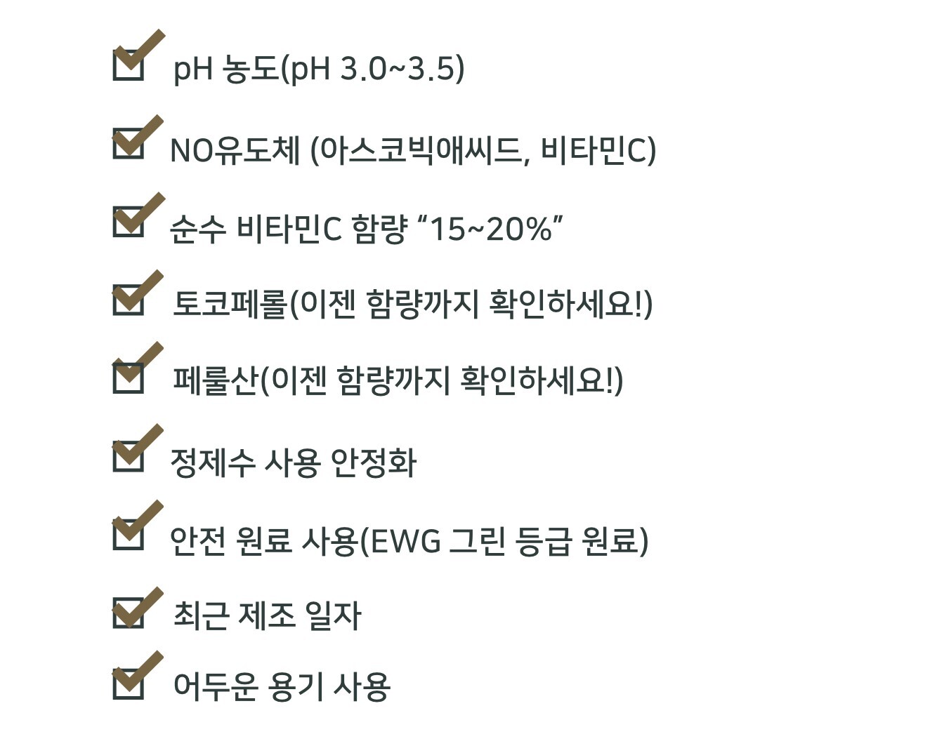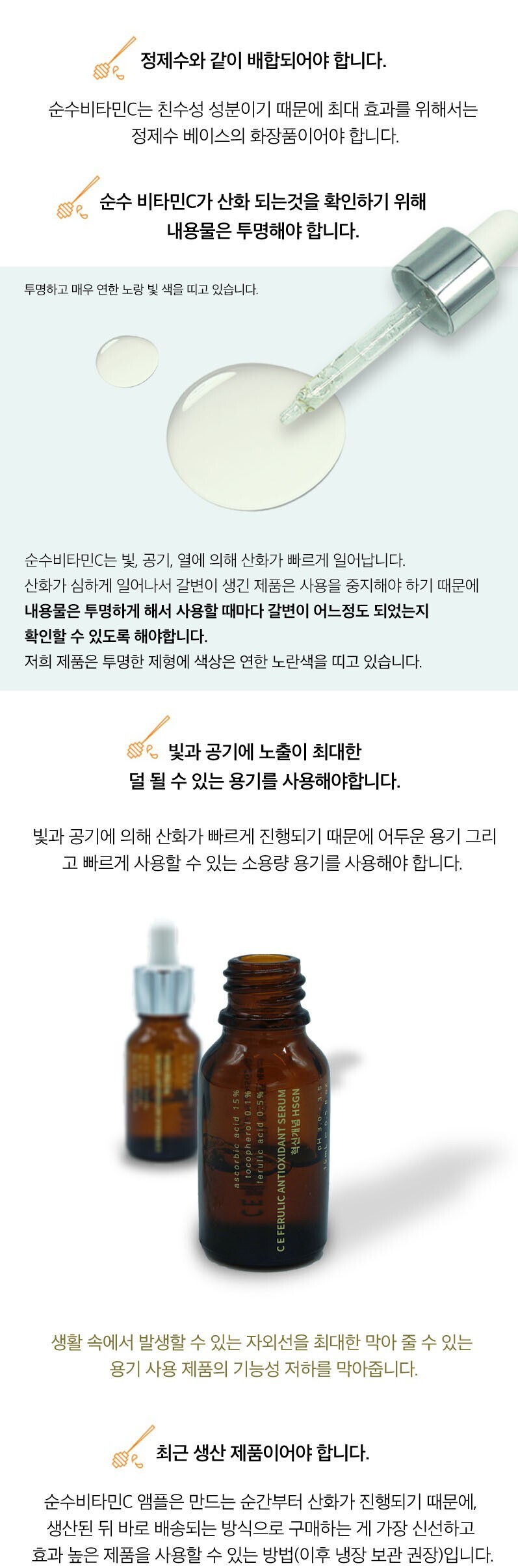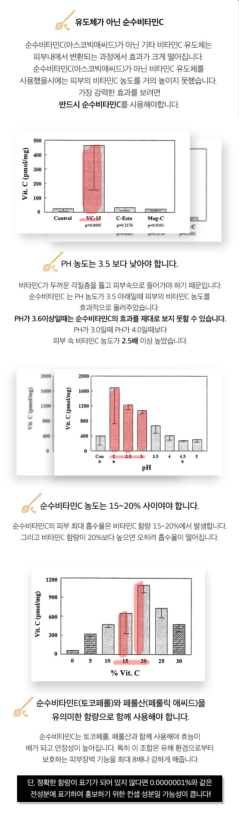 2. 비타민C 구매하시면서 지금까지 확인 안 하셨다구요?!! 비타민C 효과 극대화를 위한 " 7가지 골든스탠다드 *" 전부 달성(순수비타민C 15%(영국 DSM사 원료), 순수비타민E(토코페롤) 0.1%, 페룰산 0.5%, 10여 가지 항산화 성분, 유해 성분 무첨가, pH농도 3.0- 3.5의 황금비!)