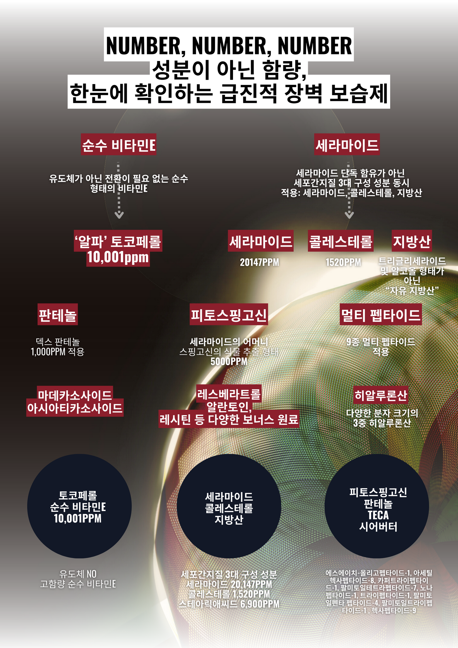 정제수, 글리세린, 시어버터, 다이프로필 렌글라이콜, 세테아릴알코올, 카프릴릭/ 카프릭트라이글리세라이드, 하이드로제 네이티드폴리(C6-14올레핀), 하이드로 제네이티드폴리데센,메틸트라이메티 콘, 1,2-헥산다이올, 세라마이드엔피, 페 닐트라이메티콘, 식물성오일, 글리세릴 스테아레이트에스이, 팔미틱애씨드, 토 코페롤(10,001PPM),베타인, 알란토인 , 피토스핑고신, 하이드로제네이티드레 시틴, 판테놀, 레스베라트롤, 세테아릴올 리베이트, 스테아릭애씨드, 솔비탄올리 베이트, C12-16알코올, 베헤닐알코올, 폴리글리세릴-2다이폴리하이드록시스 테아레이트, 병풀추출물, 마이크로크리 스탈린셀룰로오스, 세테아릴글루코사이 드, 하이드록시아세토페논, 다시마추출 물, 한련초잎추출물, 콜레스테롤, 마데 카소사이드, 셀룰로오스검, 소듐하이알 루로네이트, 프룩토올리고사카라이드, 베타-글루칸, 다이소듐이디티에이, 비사보롤, 아르간커넬오일, 펜틸렌글라 이콜, 하이드롤라이즈드하이알루로닉애 씨드, 무화과추출물, 다이카프릴릴카보 네이트, 수크로오스다이스테아레이트, 하이드롤라이즈드콜라겐, 흰목이버섯폴 리사카라이드, 마데카식애씨드, 아시아 티코사이드, 카프릴릴글라이콜, 아시아 틱애씨드, 유비퀴논, 라케모사승마뿌 리추출물, 흰무늬엉겅퀴추출물, 소듐 아세틸레이티드하이알루로네이트, 에스 에이치-올리고펩타이드-1, 아세틸헥사 펩타이드-8, 카퍼트라이펩타이드-1, 팔 미토일테트라펩타이드-7, 노나펩타이 드-1, 트라이펩타이드-1, 팔미토일펜타 펩타이드-4, 팔미토일트라이펩타이드-1 , 헥사펩타이드-9, 암모늄아크릴로일다 이메틸타우레이트/브이피코폴리머, 에틸헥실글리세린, 미로탐누스 플라벨 리폴리아캘러스배양추출물, 글리세릴 폴리메타크릴레이트, 부틸렌글라이콜